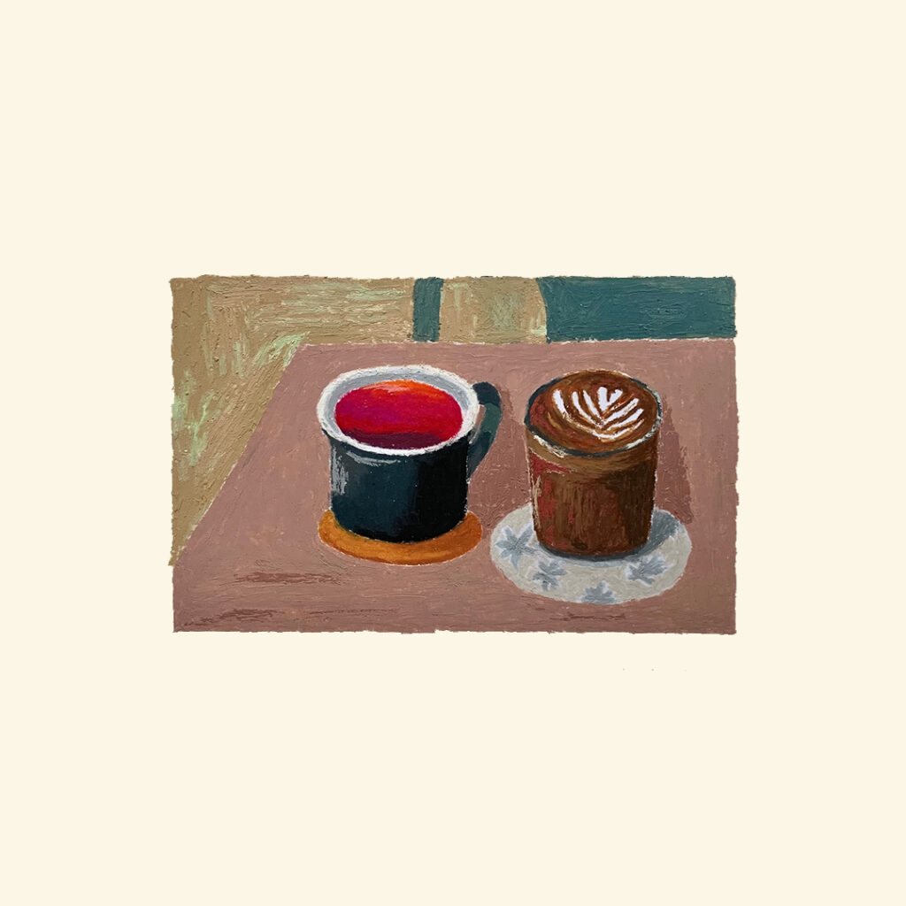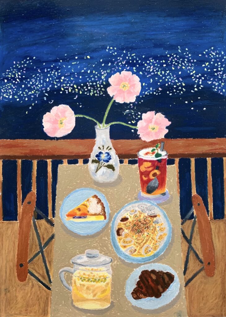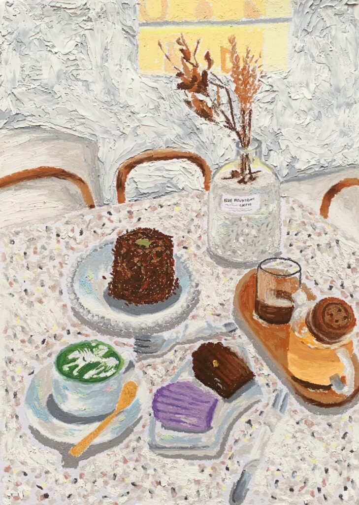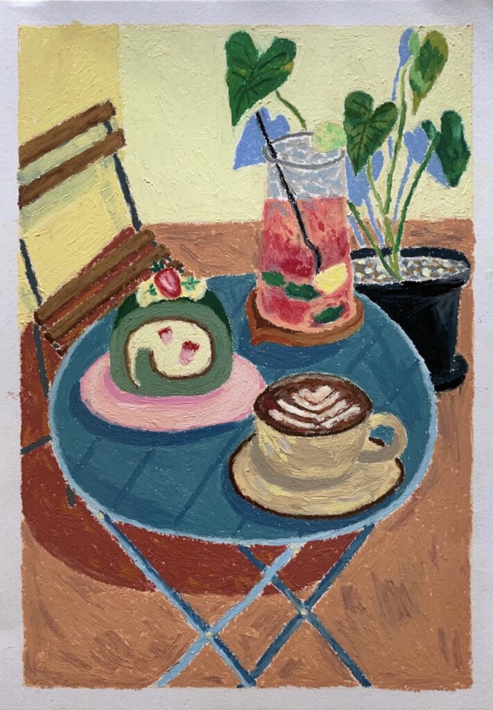 Afternoon Tea at Maison Tatei – Oil pastels on paper – 29.7 x 21 cm – 2023
