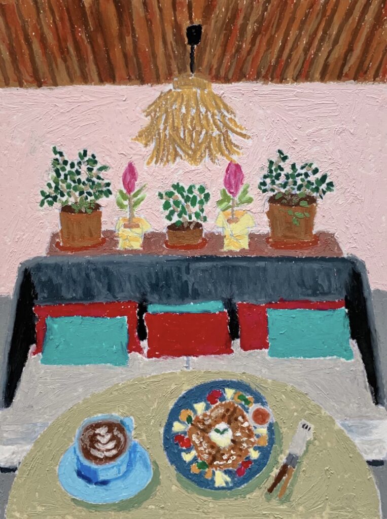 An Urban Jungle Cafe – Oil pastels on paper – 15.2 x 20.3 cm – 2023