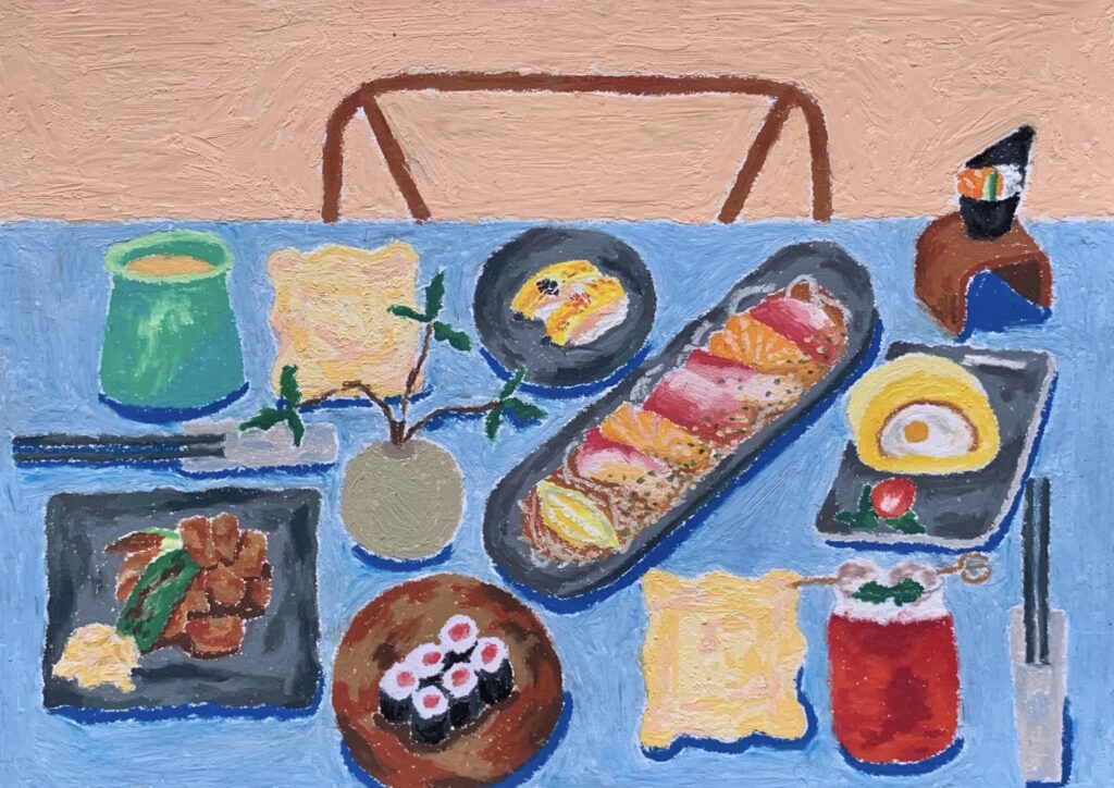 Sushi Table – Oil pastels on paper – 29.7 x 21 cm – 2022