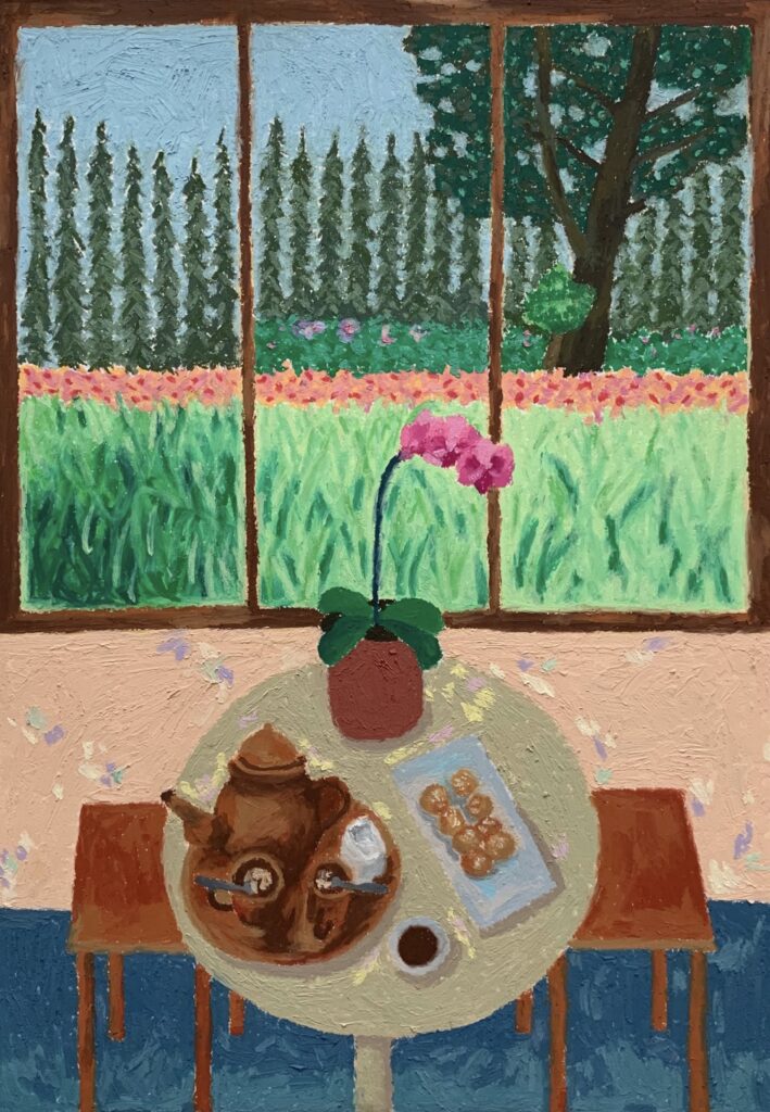 Poci Tea, Poffertjes, and Orchid with A View – Oil pastels on paper – 29.7 x 21 cm – 2023